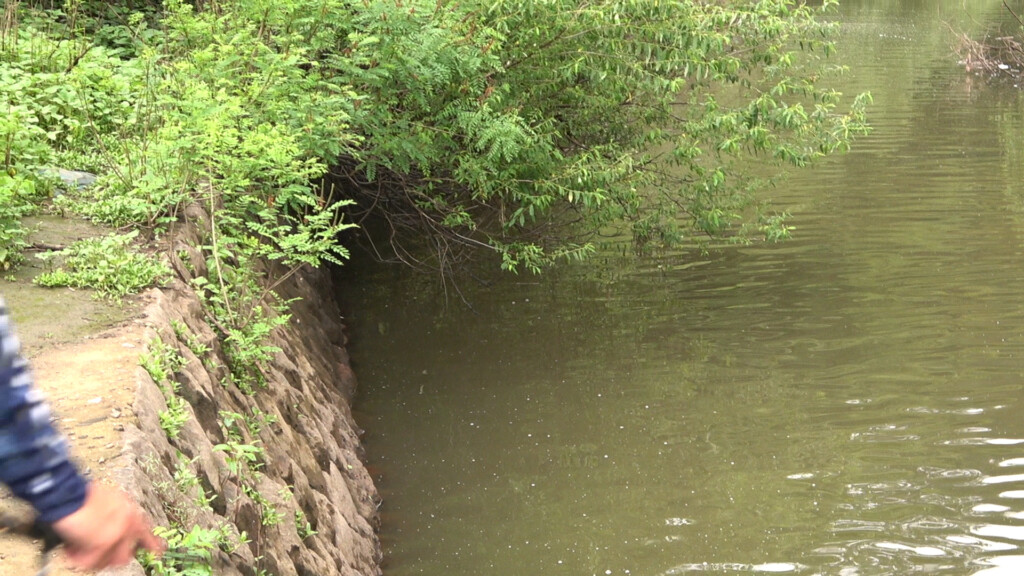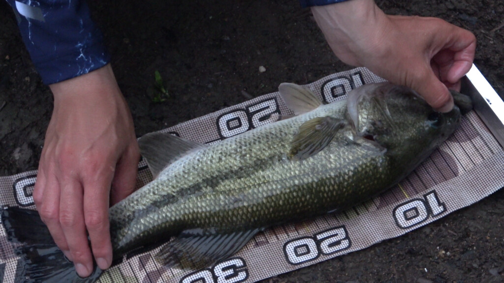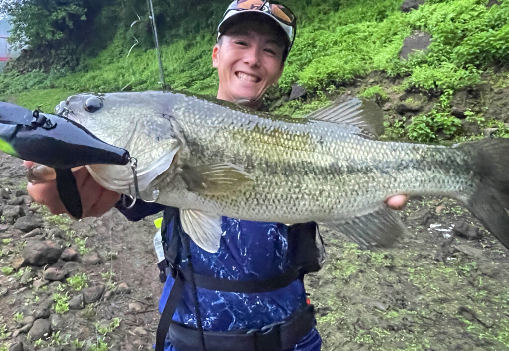 壁ギワの水面近くをガストネード110Sのスロー引きしてキャッチ!