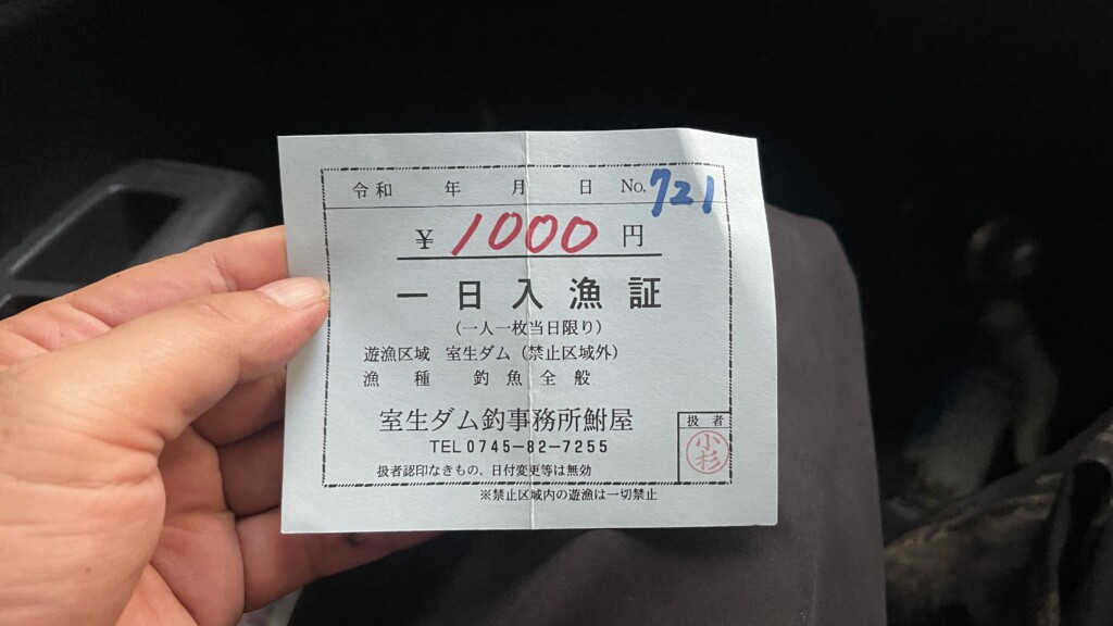 室生ダムで釣りをする場合は入漁証(1日当日・1000円)が必要。なお、入漁証はダム中流域にある「室生ダム釣事務所・鮒屋(ふなや)」さんにある自動販売機で購入できます!