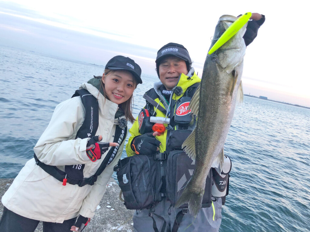 今週は、小沼正弥さんと山下うらんが、千葉県は木更津の沖堤防でシーバスに挑戦します。この時期のベイトはイワシとコノシロ。運良くコノシロの群れに当たりました。