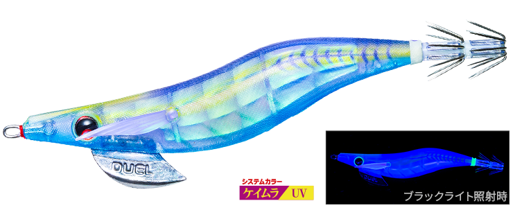 ケイムラ発光+ナチュラルなブルーで澄潮時の警戒心の強いイカをしっかり抱かせます。