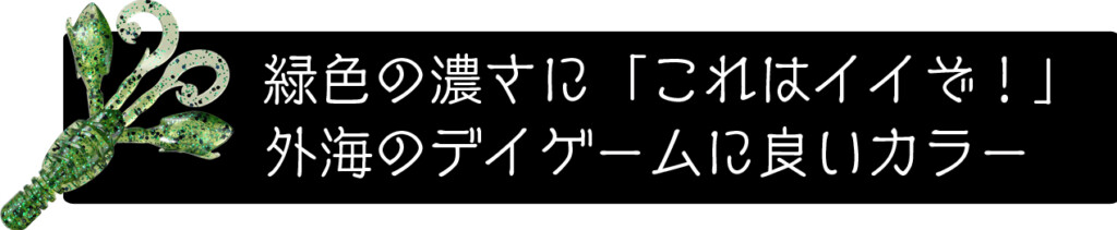 コレの元ネタはロッキンホッグのパンプキン/グリーングリッターだったんです。これをそのままグルーパーバグでもやりたいと。ところが試作の過程でやけに緑色が濃いものが出来上がってしまったんですね。