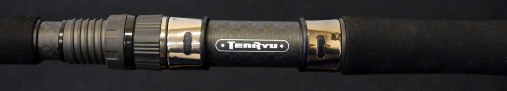 リールシート部に西陣織仕様のカーボンパイプ。スピニングタイプには信頼度の高いDPSシート、ベイトタイプはPULSシートを採用