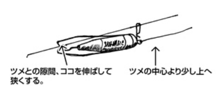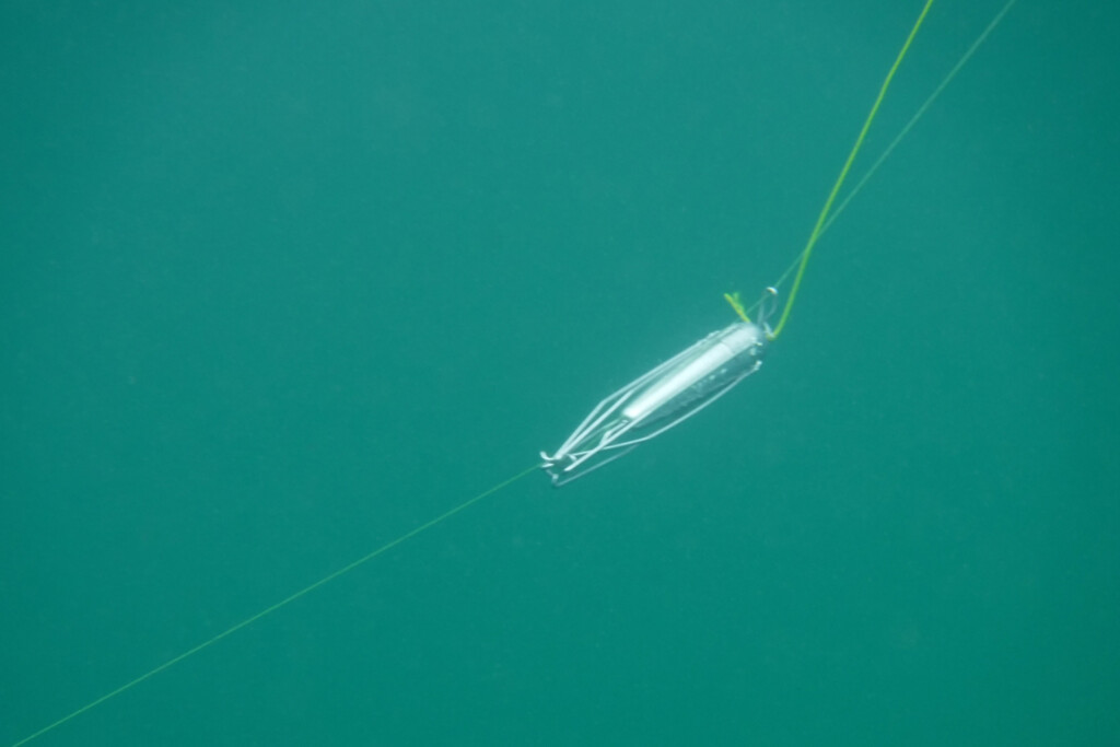 そして根掛かりルアーのラインを強く張った状態でロボをコツコツとルアーにあて、レスキューロボのレスキューフック(ツメ)が、ルアーのラインアイやスプリットリングに掛かったら、レスキューロボのラインをゆるめ、ロボのラインを引っ張ってルアーを一気に回収!