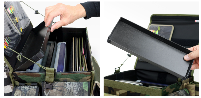 インナートレーは、片側跳ね上げ式でトレー下部への出し入れもスムーズ。そして面ファスナー止めなので取り外しも簡単。