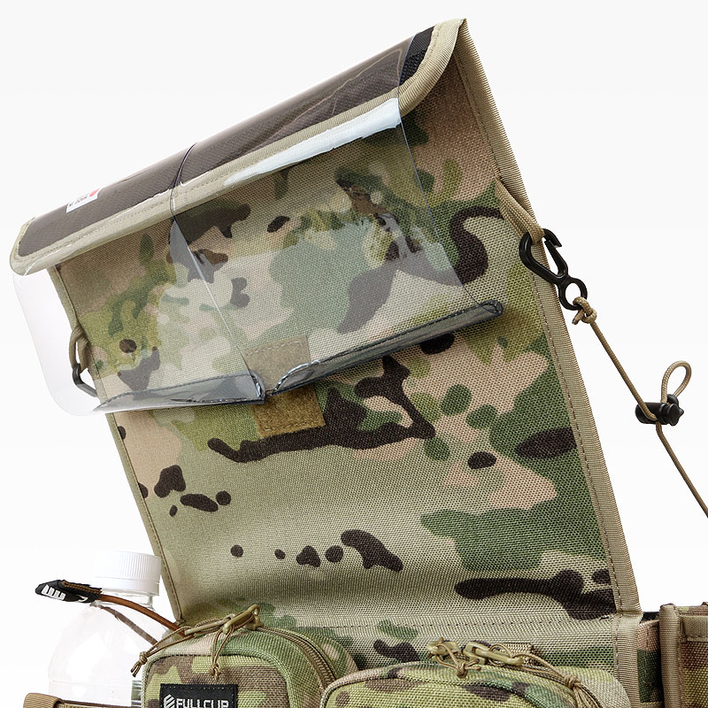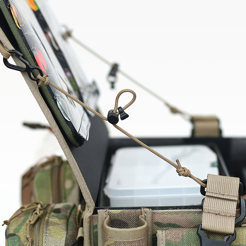 フラップ左右にはパラコードのストッパーがついています。コードアジャスター付きでフラップの開き具合の調整も可能です。また、フラップ上部の面ファスナーにワッペンなどでデコレーションすることができたり、エクスチェンジャーの保護フィルムを止めるストッパーとしての役割も果たします。