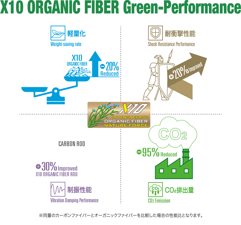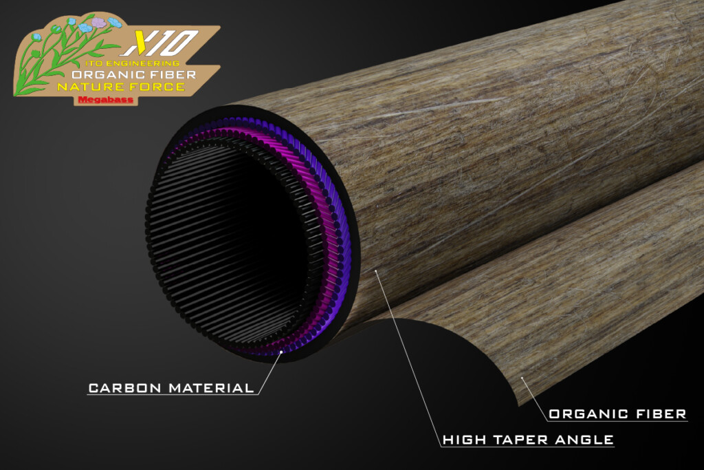 「X10」オーガニックファイバーブランクスとは、自然素材から採取されるセルロースミクロフィブリルを骨格とする植物系天然繊維を主軸として構成したブランクスで特に制振性能は30%、衝撃吸収性能は20%向上しているという。