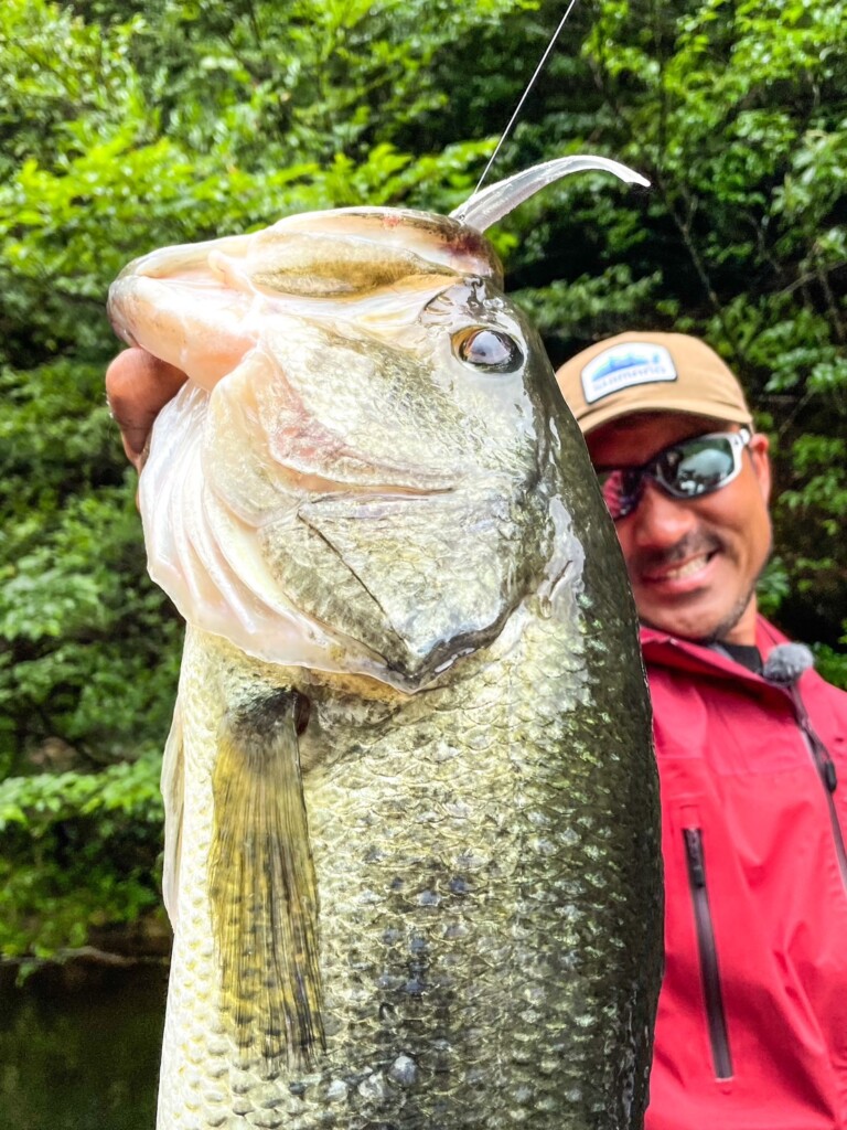 流れの当たる草むらにワームを落とすと…