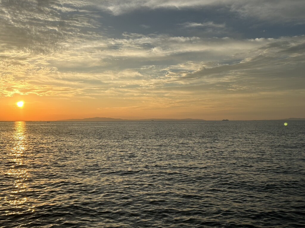 太陽が淡路島の向こう側へ沈み…ワクワクしながら準備をします。釣りに行く度に毎回異なる夕日を見られる、というのも釣り人の特権ですね!