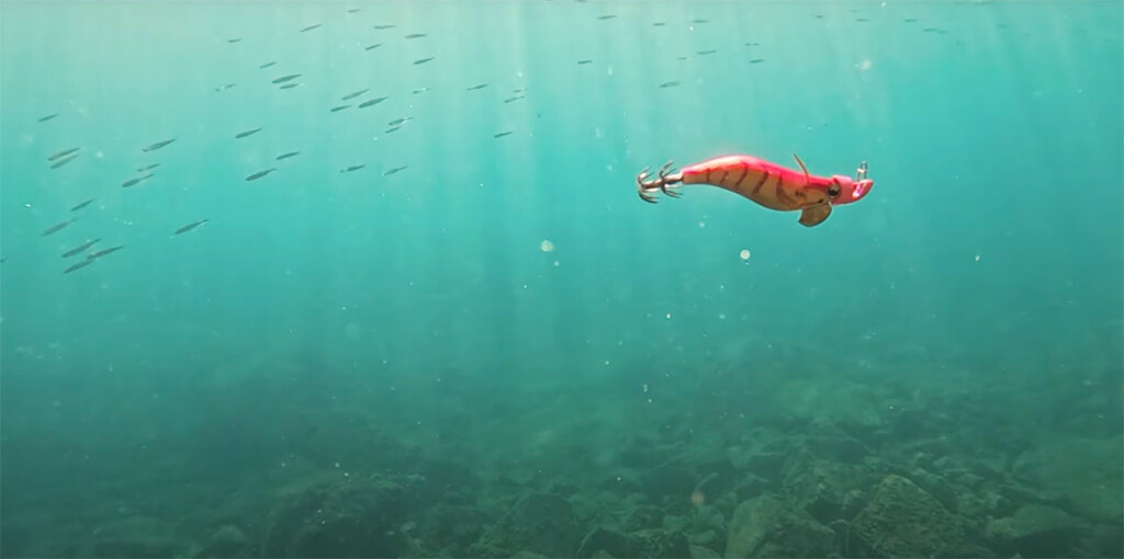 エギを投げる、エギを底まで沈める、エギをシャクくりあげる、ここまでは通常のエギングと変わりません。