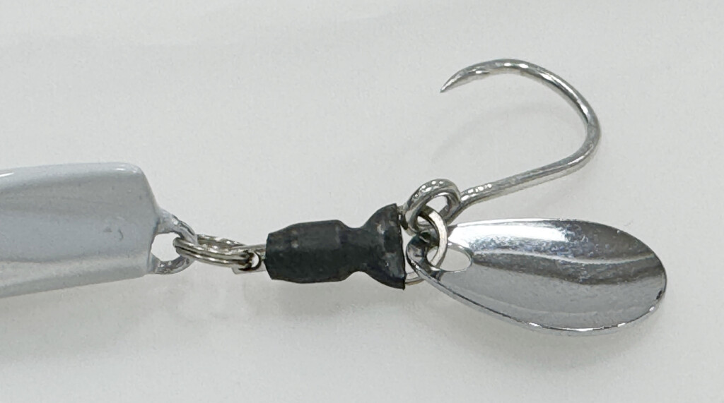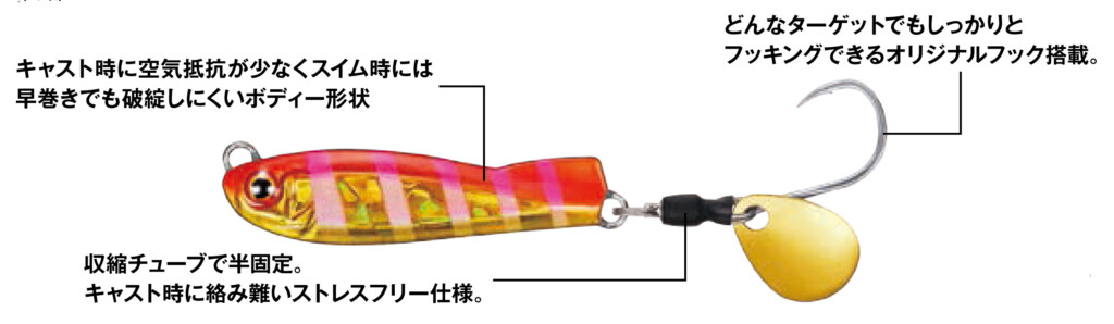 ブレード部分には収縮チューブが採用されていて、キャスト時やフォール時にリーダーにフックが絡み難い、ストレスフリーな設計になっています。