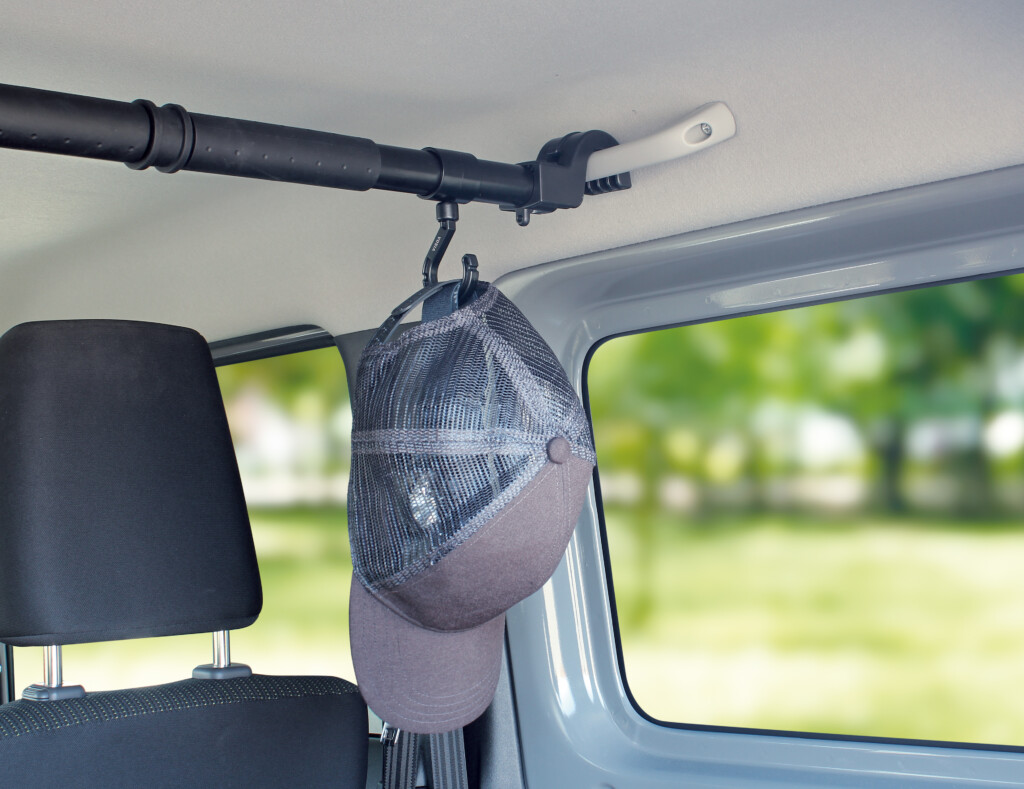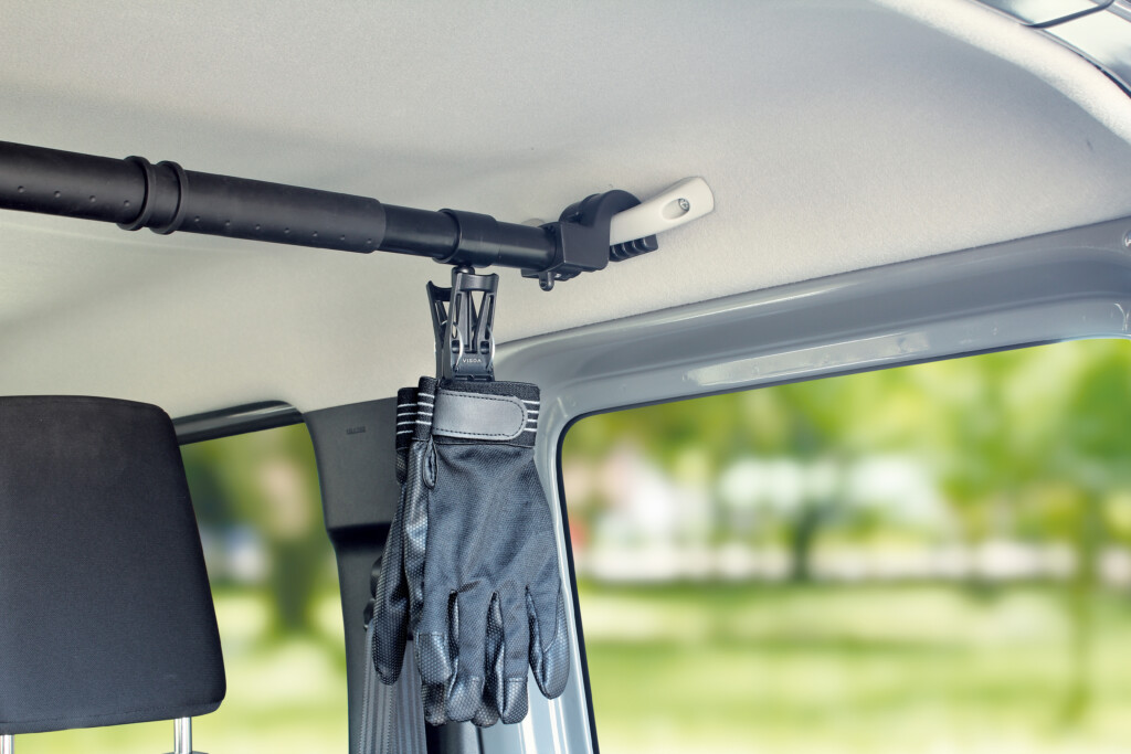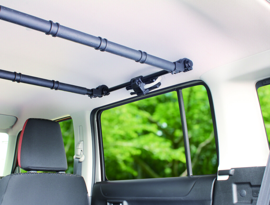 アシストグリップ左右一対だけで、車内用バーの前後2本掛けを可能に。