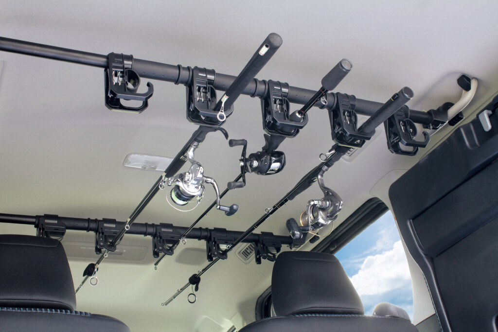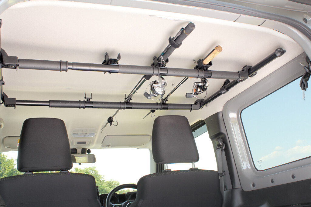 車内用バーの上側でロッドを安定ホールドでき、車内を最大限広く使えるオーバーロッドホルダー。落下防止ストッパーリング付きで、こちらもフロント・リア独立設計。