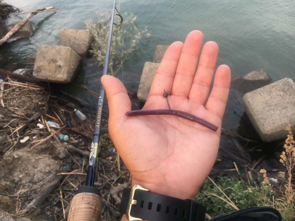 大桐の消波ブロック帯をていねいに撃っていくと、フックアップできないバイトがかなり多く、20㌢前後の小バスやギルの魚影が濃くなっています。ただし、日中には反応がないことも多く、夕暮れ寸前のゴールデンタイムにバイトが集中していましたね。