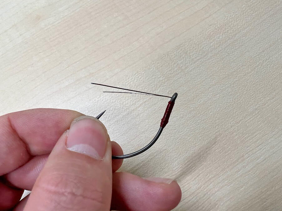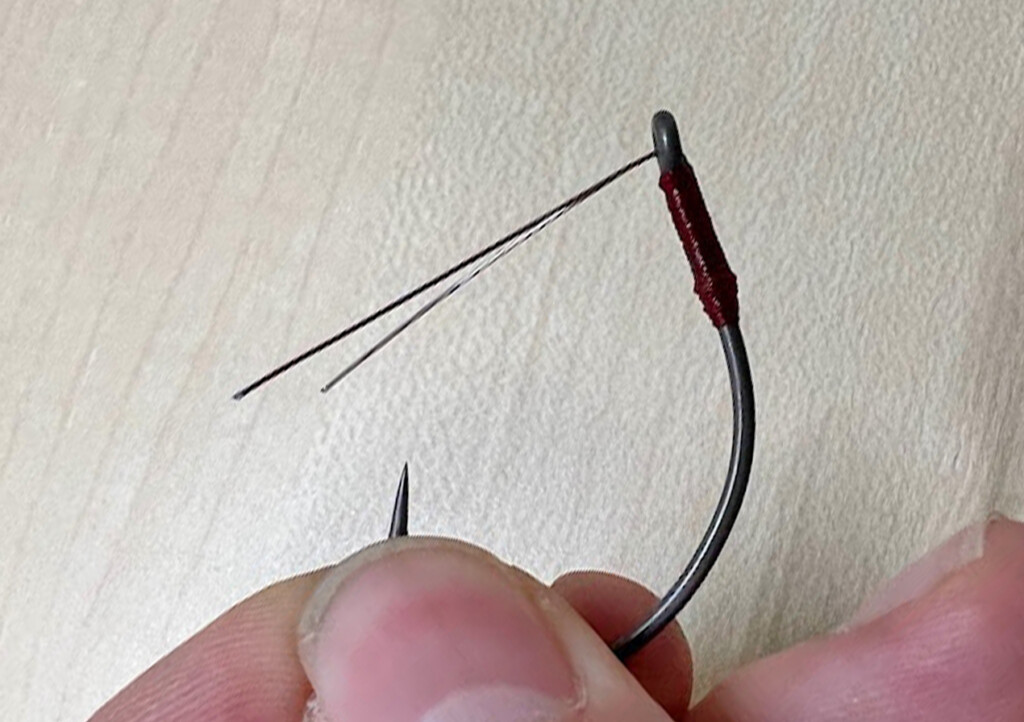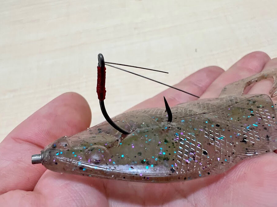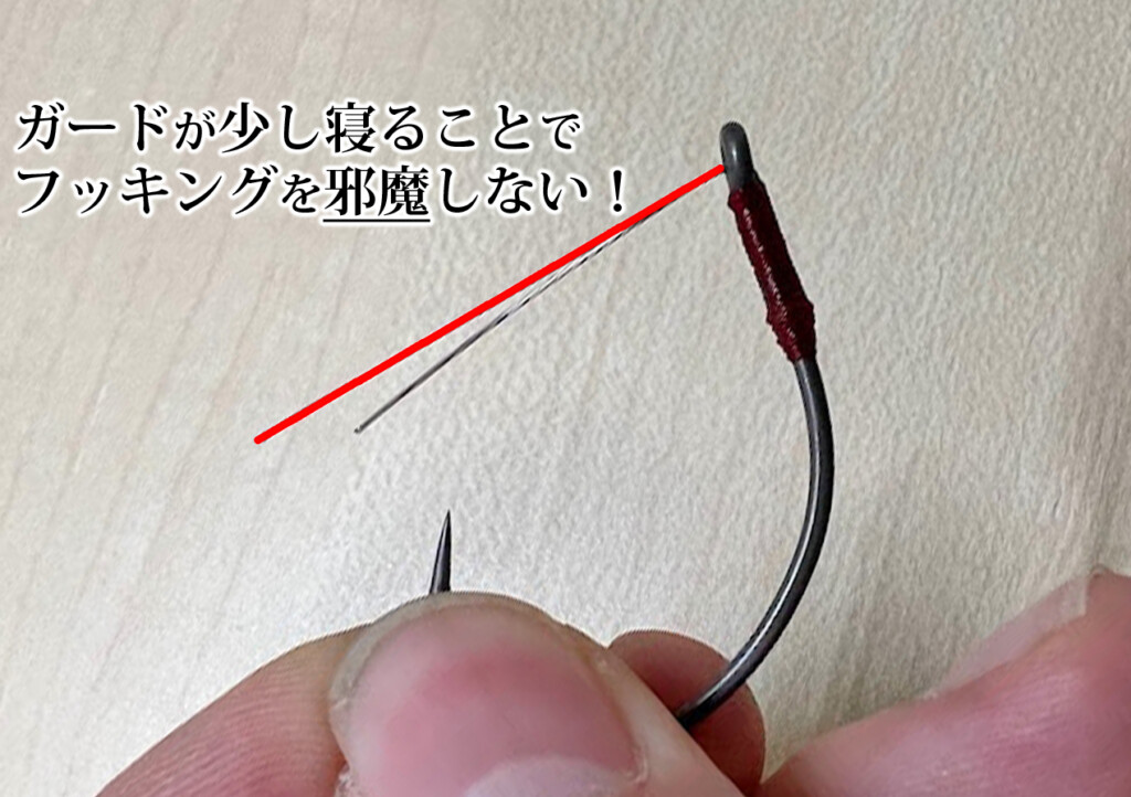 この角度がキモで、少し寝た角度になることでフッキングの邪魔をしないんだそう。ちなみにここが立っている場合、バスの口に入った際にガードが先に刺さってしまいフッキングしないこともあるんだとか。