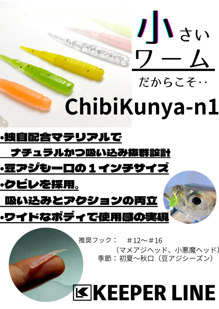 関西を代表するハイプレフィールド“淀川”のスレバスを如何に食わすかを追求したコダワリ系ハンポワワームを取り揃え、その緻密なワーム製作技術と、現場で得てきた知識と経験を活かし、SWライトゲーム界の世界にも足を踏み入れることに! 第一弾目にアジングワーム「Kunya-n 2in」が発表されましたが、第二弾としてこちらも登場!