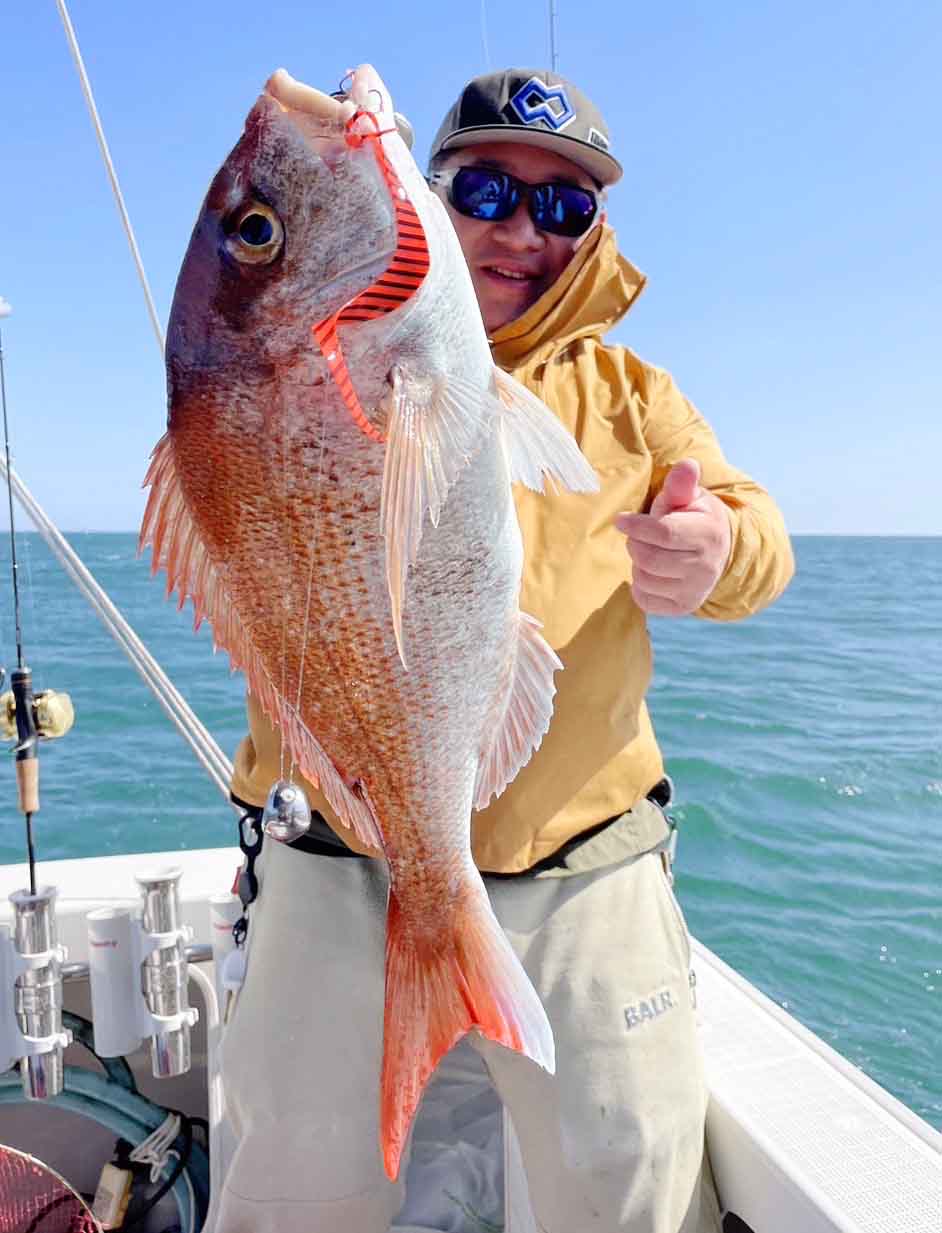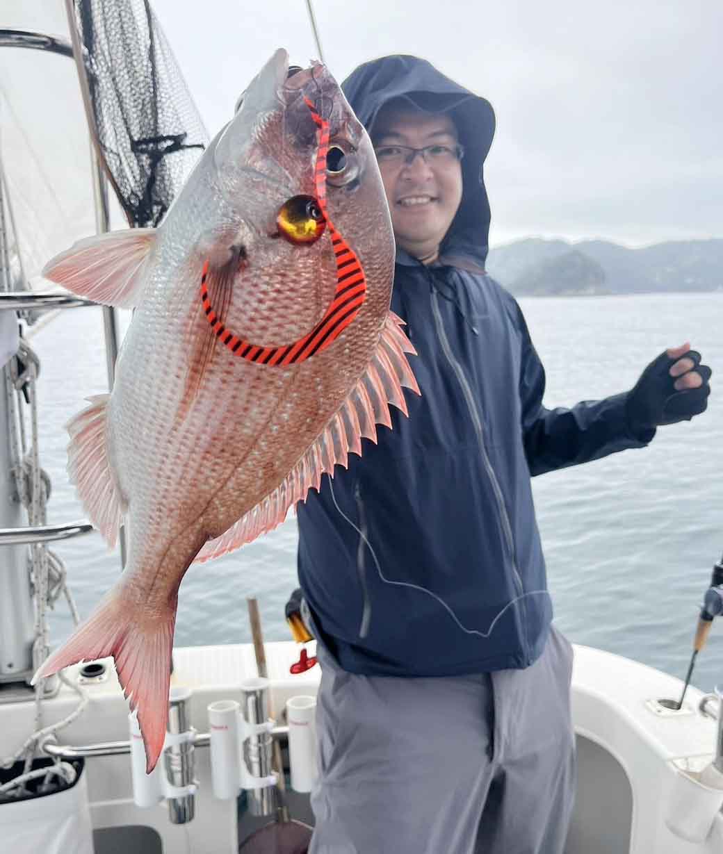 そんな「ビンビン玉 T+ネクタイ マスターカーリーSTRONG」ですが、プロト段階から当船のお客様に使っていただき、皆様にもイワシパターンをはじめ、ありとあらゆる状況で、良い釣果を上げていただいております。特に中層に浮いたマダイやスローリトリーブにしか反応しないマダイには効果バツグン。