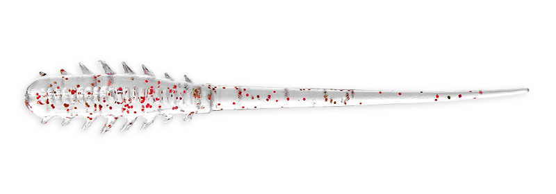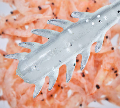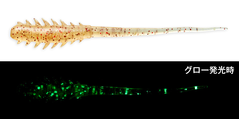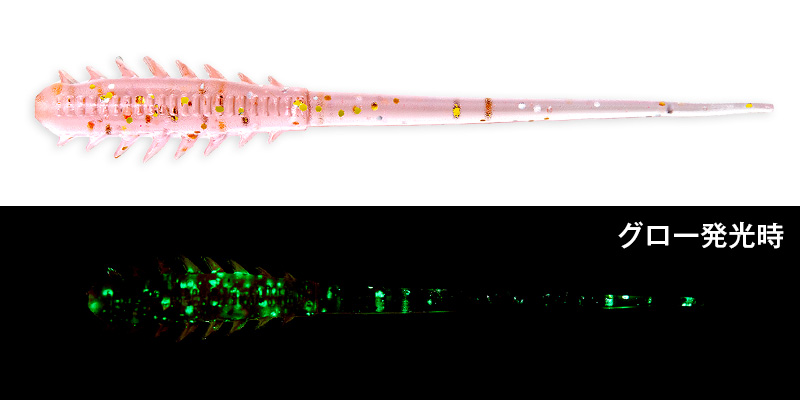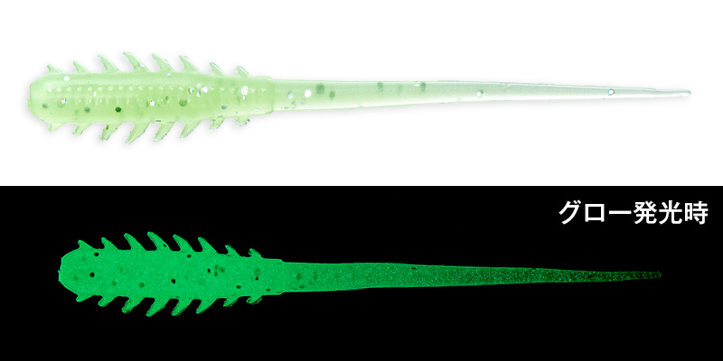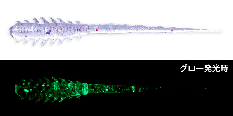 ハリのあるボディは水中で水をシッカリ押しながらアジに対してアピールしつつ、せり出た複数パーツが超微波動を発生させると共に、ボディ後部のピンテールの異なる動きで口を使わせる。張りのある素材によるワーム持ちの良さと水を押す力を生かし、文頭でお伝えした、アジが高活性で効率重視で数を稼ぎたい時、夕マズメ時のテンポの速い釣りなどで効果を発揮。当然ナイトゲームのアミパターン時にも有効。