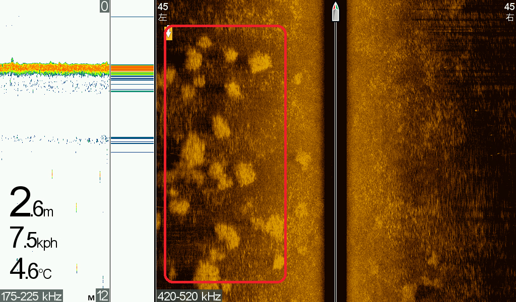 具体的な魚探画像でご説明すると、この下画像の赤で囲んだ枠内は縦に長いエビ藻のパッチ!がある場所です。