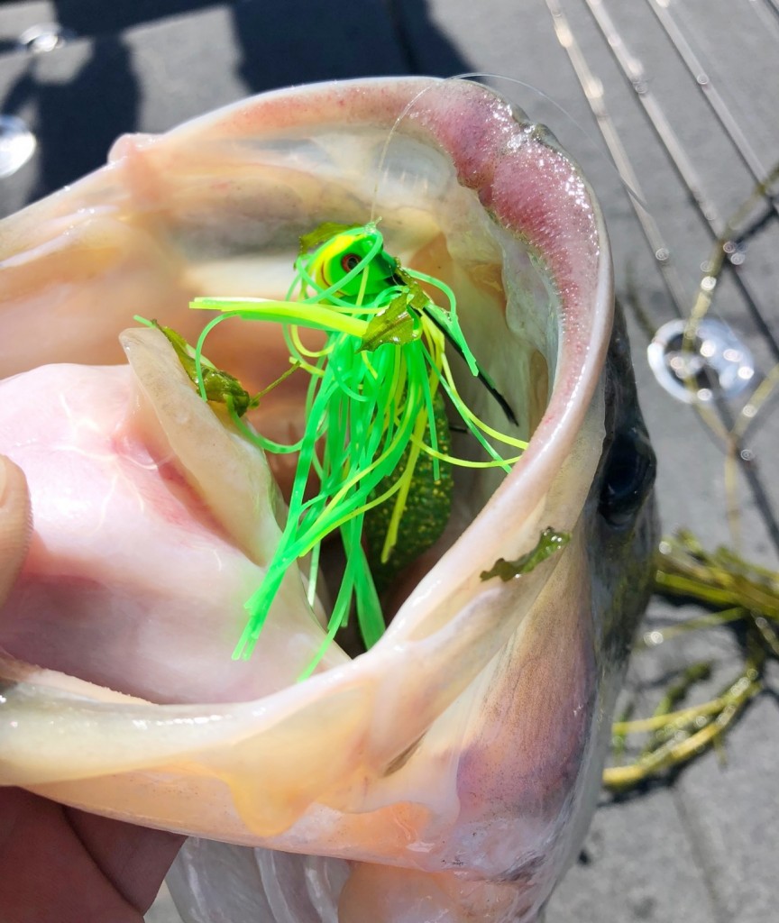 晴れて光量の高いコンディションではエビ藻のシェードに対しバスがサスペンドするので、そんな場合はエビ藻にAEを絡めながらのアプローチが有効!