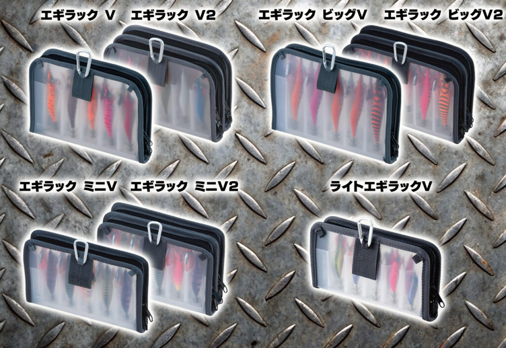 「エギラック V」には大きく「V(エギ4号対応)、ミニV(エギ3号対応)、ビッグV(エギ5号対応)」といったサイズの異なる3モデルが揃い、各モデルにエギを10本収納できるモデルと20本収納できる2タイプがラインナップ。そして「ライトエギラックV」は2号程度のより小さいエギに対応するケースになっています。