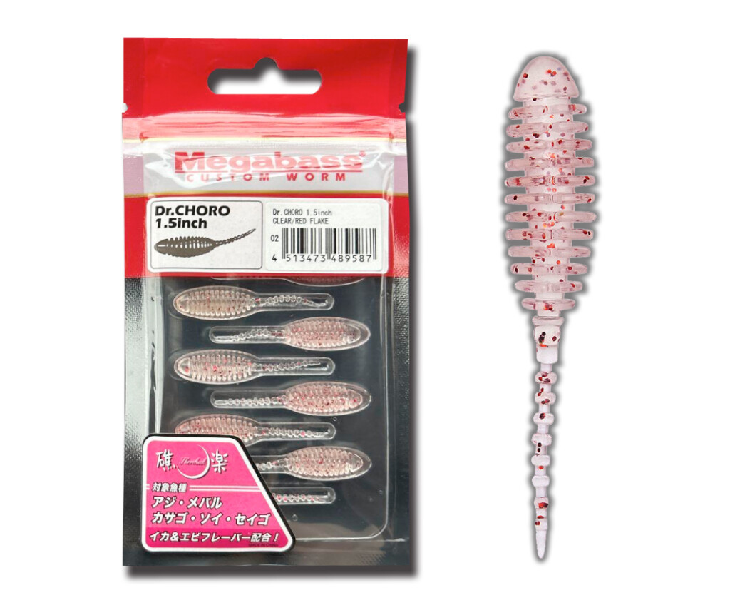 アジメバ狙いで実績の高いワームとして知られているのが、メガバスの礁楽ワームシリーズ中でも最小となるドクターチョロ1.5inch、2inch。