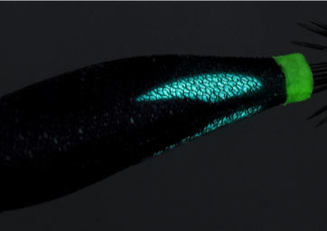 腹部にイカから見やすい発光色「490グロー」のバイトマーカーを搭載。なお、腹部に設置されているのはオモリグは下から上に誘い上げる釣りのため、下から追尾するイカに見えやすい位置に…という理由から。