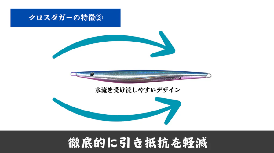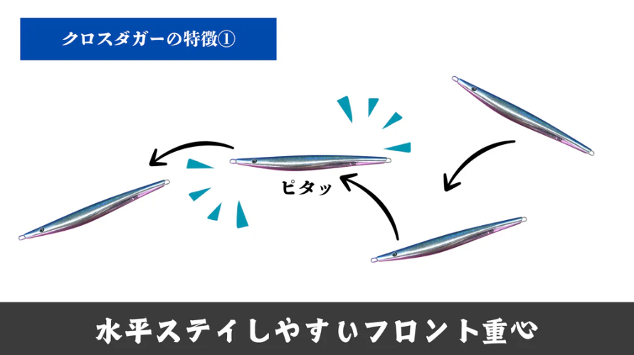 「クロスダガー」の大きな特長は、フロント重心にすることでジグをビタ止めした際、なるべく水平に近い姿勢でステイできるようになっている点。