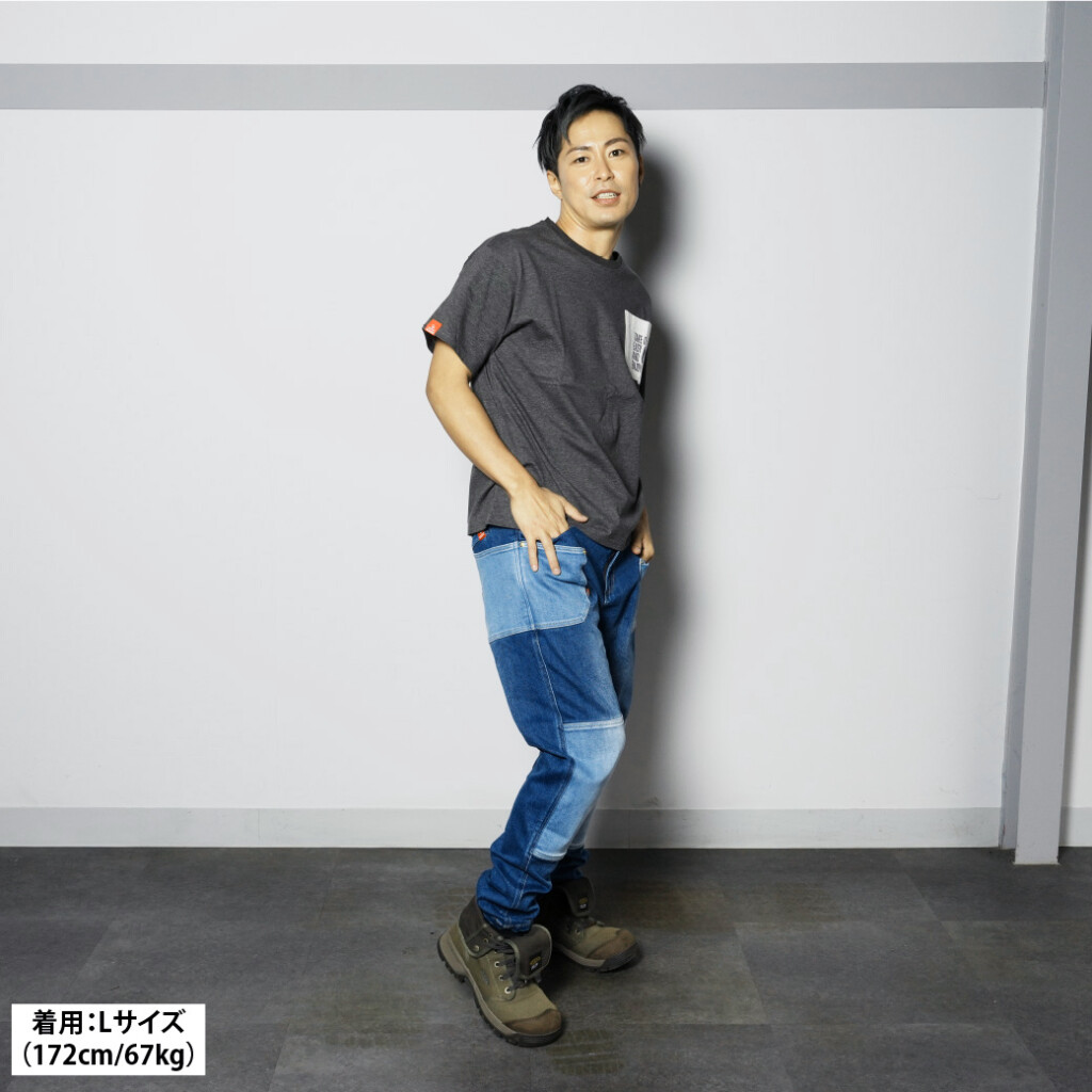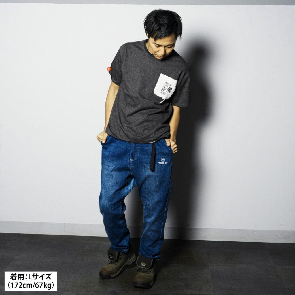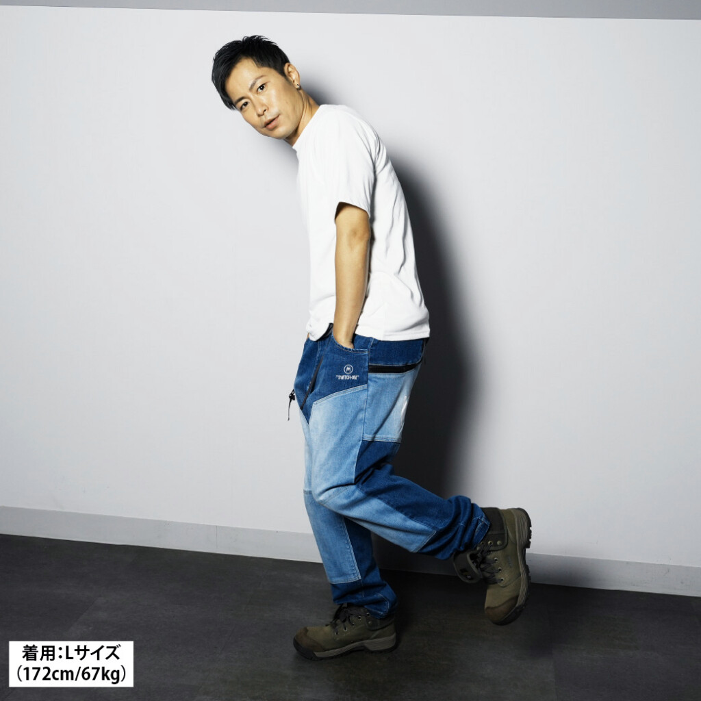 ヒザ、外付けポケット、ガゼットは、異なる配色カラーで組み合わせた「SWITCH-ON」ならではのデザイン。さらに、ウォッシュ&ブラスト加工で、ユーズド感のあるアタリと色落ちが加えられており、カジュアルライクなコーディネートが楽しめます。シルエットが美しく、Tシャツやパーカーなど、カジュアルスタイルに合わせても◎。ややタイト目やジャストサイズで着用するのも、大きめサイズでワイドに着用するのも◎。お好みに合わせてサイズ選んでみては? こだわりが満載な1本をぜひお試しを。