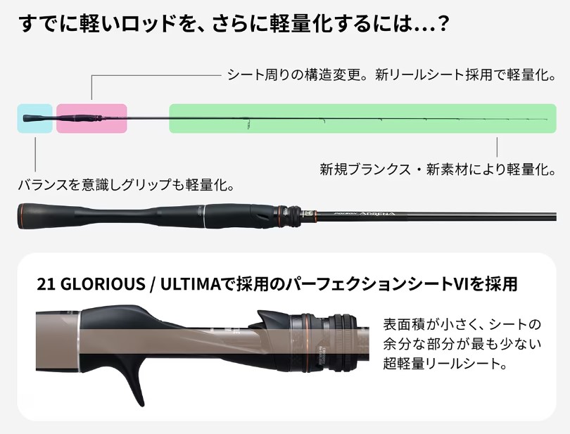 真の軽さをコンセプトに取り入れた「ポイズンアドレナ」は、新規素材の導入などによりブランクスの更なる軽量化を実現。さらに、新型リールシート・パーフェクションシートⅥの採用や、それにともなうリアグリップの構造変更によって、ロッドの自重そのものも大幅に軽量化。全モデルに比べ10%超の軽量化を実現。