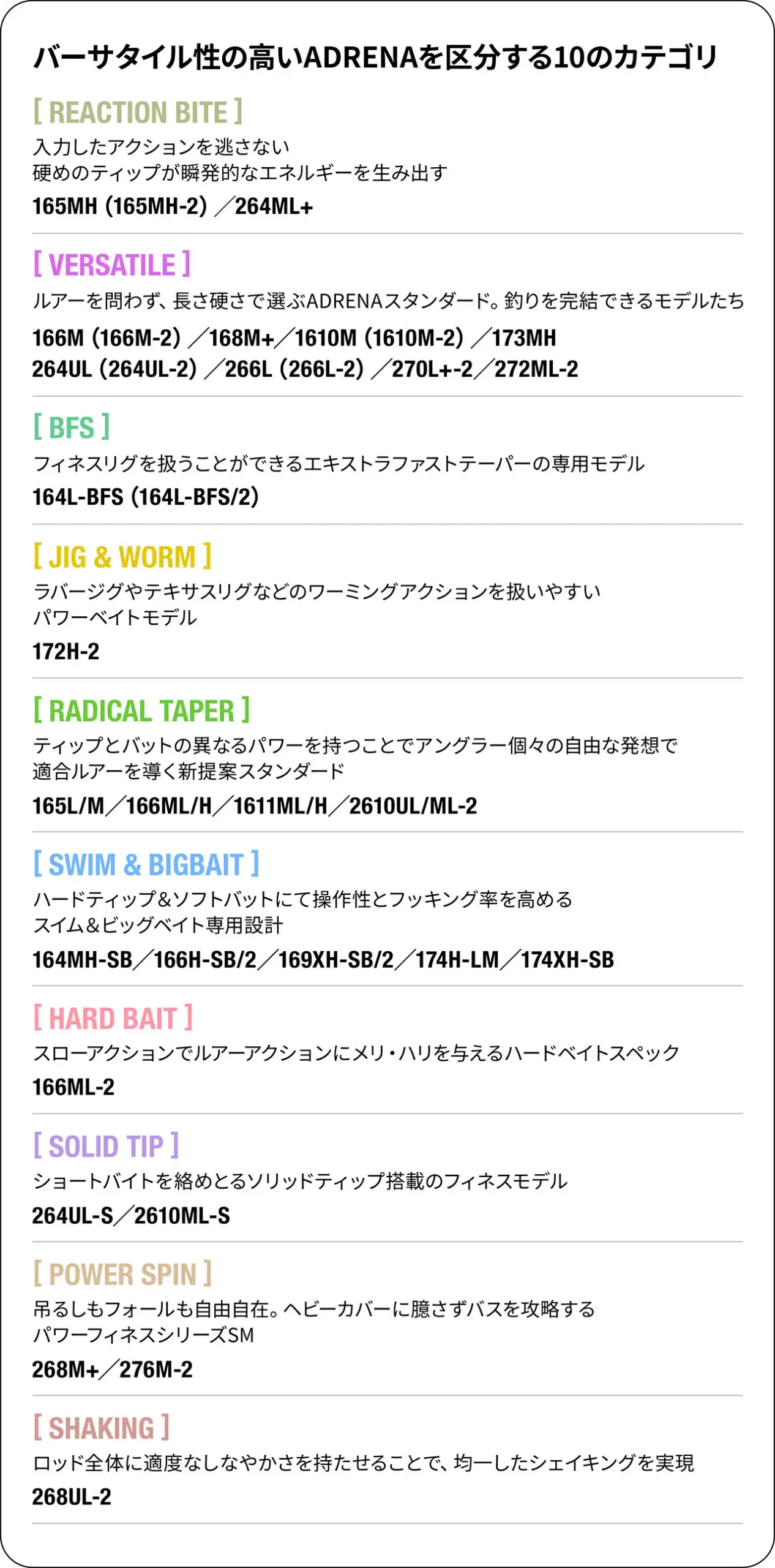 “できることの多さ”を追ったポイズンアドレナ。フィールドを問わず、様々なフィッシングスタイルに対応するべく、新たなラインナップは「VERSATILE」「BFS」「JIG&WORM」「RADICAL TAPER」「SWIM&BIGBAIT」「HARD BAIT」「SOLID TIP」「POWER SPIN」「SHAKING」「REACTION BITE」の10カテゴリー展開。
