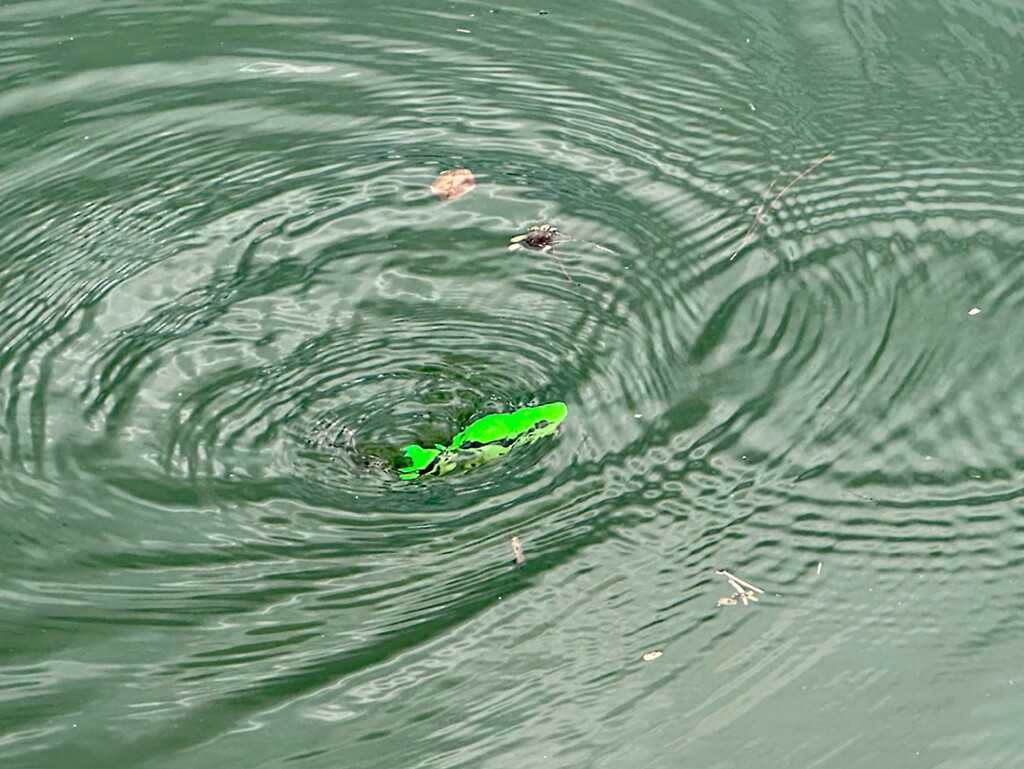 野池では予想通りカエルカラーが大活躍。三原プロの「MJポップ」ハウツー動画は近日オカッパリを舞台にイマカツYouTubeチャンネルで公開