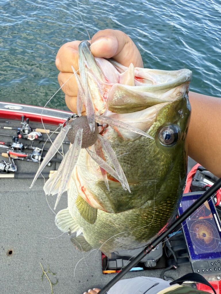 この時のエリアは、南湖の南エリア(柳が崎沖)で、ウイードエッジ、チャンネルの釣りがメインでした。使用リグは「コイケフィッシュ」、「コイケフルキャスト」(7g)のヘビーダウンショットリグ。