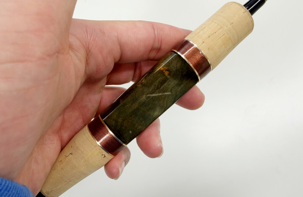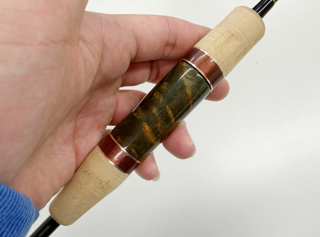 リールフットを傷つけないようABSの保護リングがインサートされた、細身のオリジナルシートを搭載。センターグリップには染色された“メープルウッド”を。
