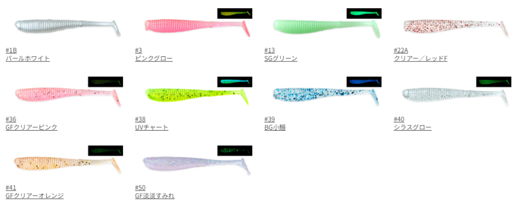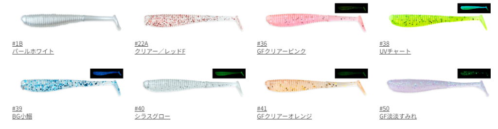メバルやアジに見つけてもらいやすく、食わせ力にも長けている程良いサイズ感、ボディの真ん中からテールにかけてスリムになっているため、軽量ジグヘッド装着時のフォールや、デッドスローリトリーブでもテールがシッカリ回転してくれて、ベイトフィッシュにソックリな動きを演出し、ターゲットを引き寄せてくれるという。