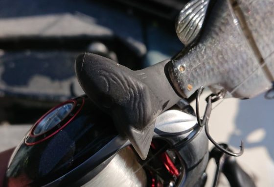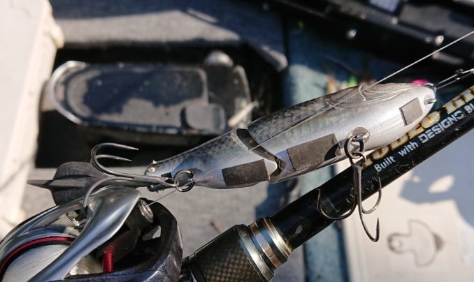 「ギルロイドJr. ブーツテール」の使い所としては、まず板オモリを貼ってスローシンキングチューンにして、バスを発見したらバスよりも岸側に投げて、ボトムに置くこと!