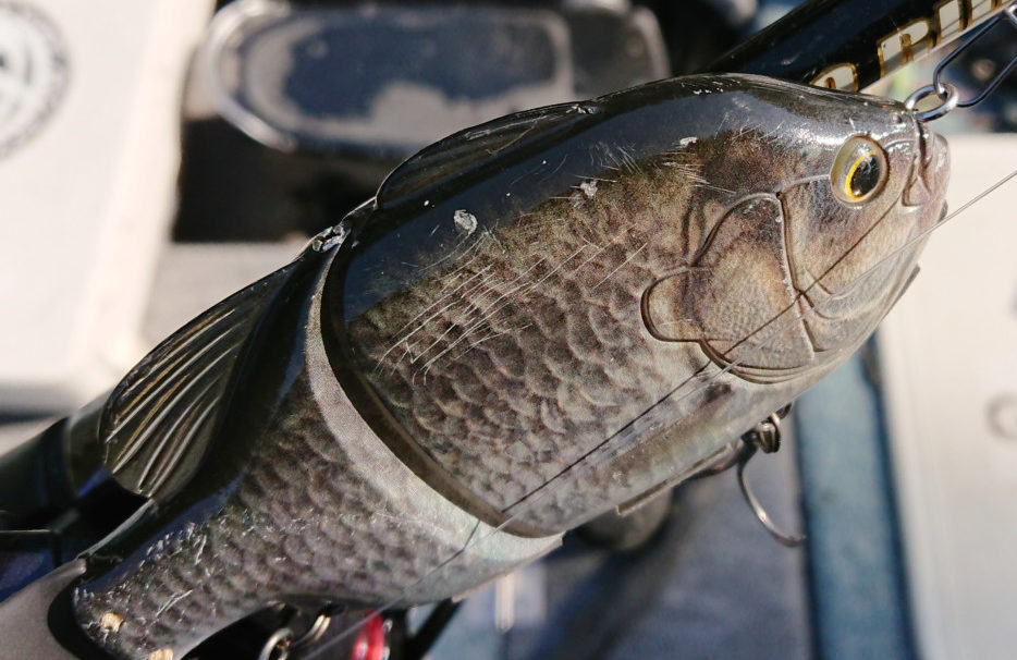 それが同じく「ギルロイドJr. ブーツテール」の「寒鮒 銀」カラーになると、ルアーの目前まで近づき、本物かどうかを吟味するようにジッと見て、そのままバイトするバスもいたほど!