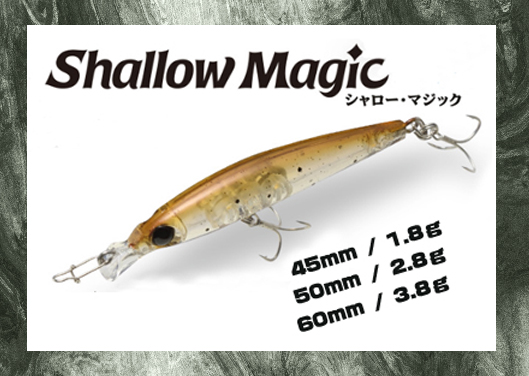 さて、普通に攻めたら根掛かりが多発することが想定される場所で私が愛用しているルアーなのが、アクアウェーブの『シャローマジック』というルアーです。シャローマジックのサイズは(45mm/1.8g)(50mm/2.8g)(60mm/3.8g)と3種類が発売されており、いずれもその名のとおり、シャロ―攻略特化型ミノーで、水面下20cmまでを狙うために開発されたミノーになっています!
