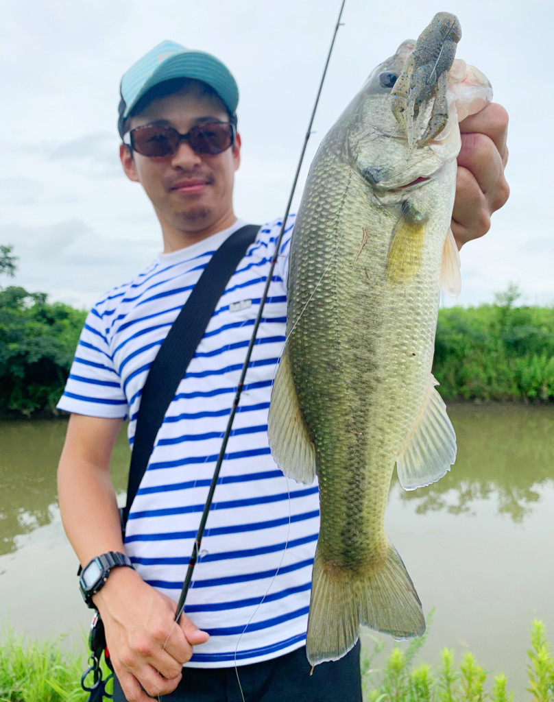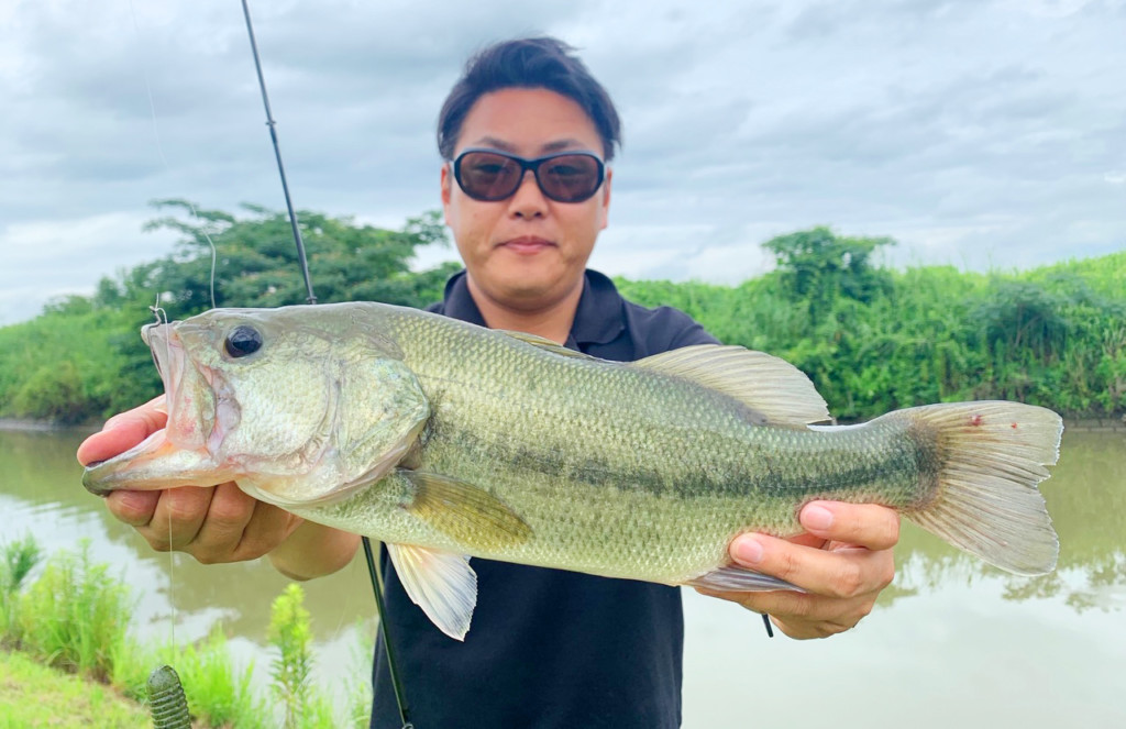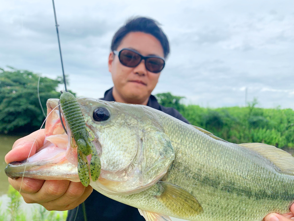 そんな中、その水位が安定傾向に入り出したタイミングで、魚がカバーにタイトに付いて浮き出したので、夏の王道のフォールベイトの釣りを試すと同行者にグッドバスがヒット‼︎