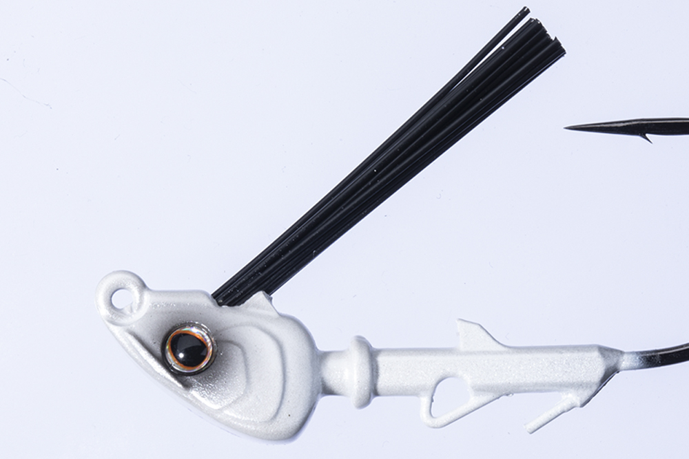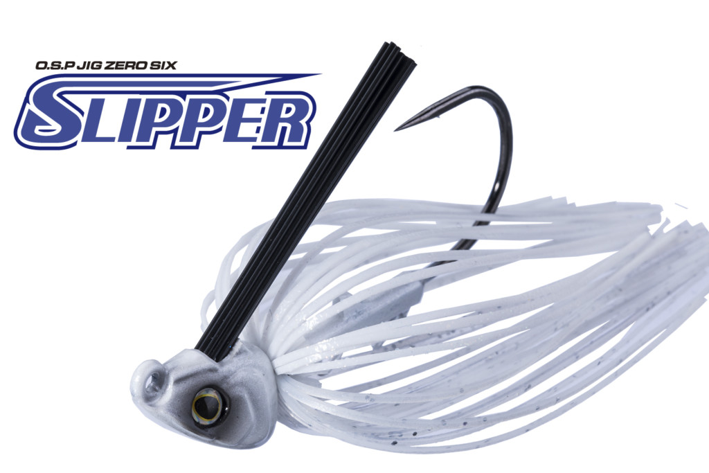 スリッパーは沈んでる枝といったライトカバーから消波ブロックや水辺に倒れ込んだ木、奥行きのあるブッシュカバー等のあらゆる場所を気にすることなく巻けることをコンセプトにした。スイミングジグなんです!