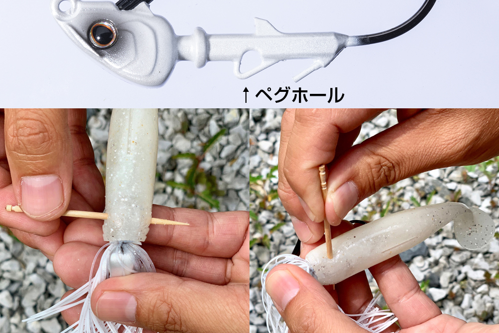ワームキーパー部のペグホールに側面からペグ(つまようじ)を挿すことで、トレーラーワームのズレを完全排除出来ます。