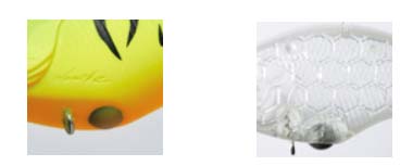 下写真右:ハニカムスーパーHPボディ(PAT.)=ボディの内壁をハニカム状に削り取りとることによって軽量化し浮力をUP