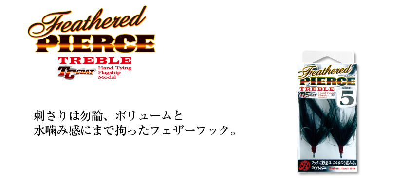 TCコートの採用で、高い貫通力と強度を誇るリューギの定番トリプルフック「ピアストレブル」。それに、フェザーを纏わせたものが「フェザードピアストレブル」です。