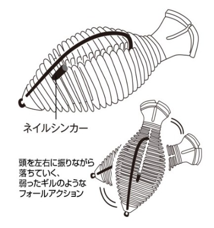 このリグを使用することで着水と同時に、ジワーッと弱ったギルのような、頭を左右に振りながら落ちるフォールアクションを演出できます。