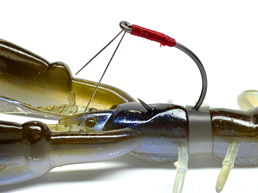 「ゲンタホッグ」の装着基本。フックは「ヘビーガードタリズマン」の#1番。ガードとアーム、ボディの突起部分のトライアングルゾーンでガードするためヘビーカバーでも難なくスリ抜けてくる