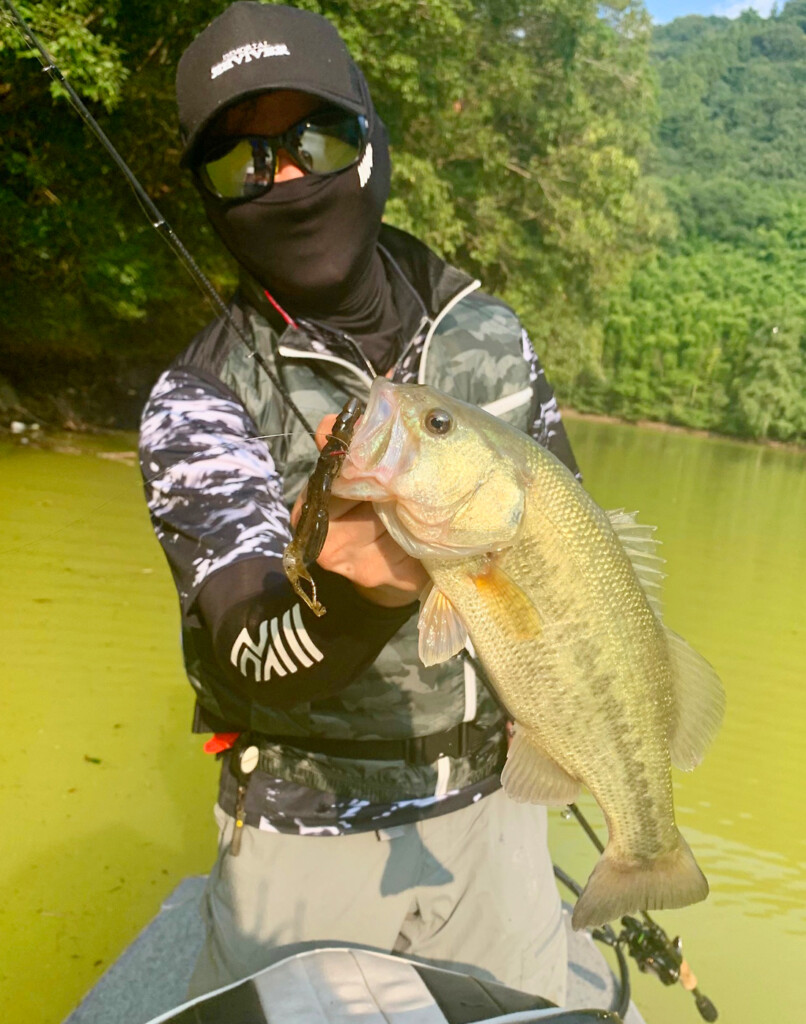 雨も降ってないのにオドロオドロしい水色にドン引き……水温は31度超え。それでも「ゲンタホッグ」のネドリグならドコでも簡単に釣れた