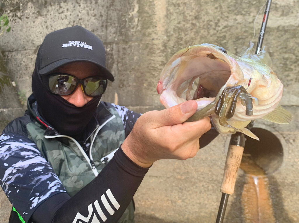 結局、運よく朝の数時間でお題は決着したため事なきを得たが、その後の体調悪化で集中力のが必要なTOPはとても無理……。とにかく何でもよいから魚を触ってフラフラの身体と気力を夕方まで繋ぎ止めようと、今江的に簡単便利でスボラ確釣ランキング1位の「ゲンタホッグ」のネドリグを使うことにした。
