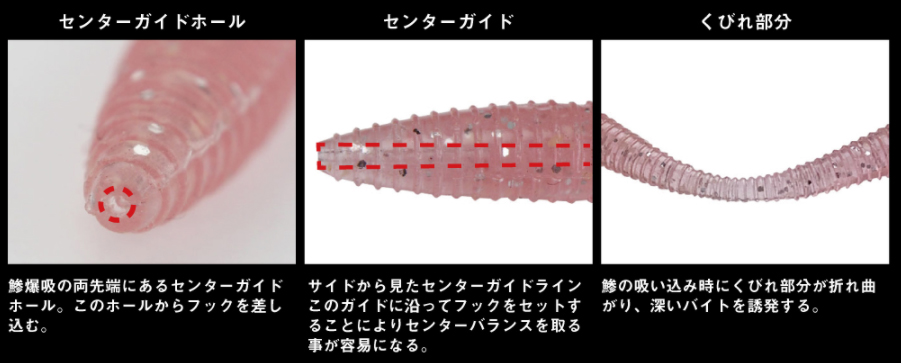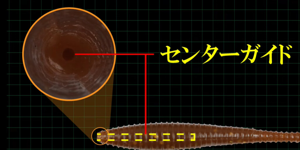 また、フォルムが上下左右対称の円柱型である事からフックをセンターガイドに通してセットされていれば、ワーム本体が裂けたとしても別の箇所からフックを出すことによりバランスを崩すことなく使い続けることができるようになっています。