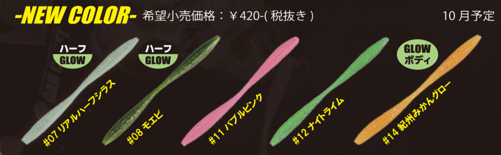 全体のシルエット的にはボリューミーでアピール力が強いワームなんだけど、ワーム本体の素材は少し硬めに設定してあり、修特有のついばむようなファーストバイトでワームがずれることなく、2回目の大きい吸い込み時に、くびれ部分とのバランスにより違和感を与えることのなくバイトに持ち込める設計となっています。