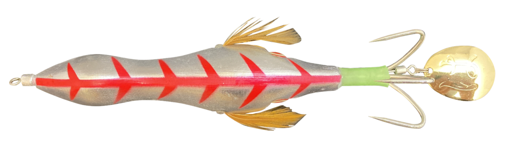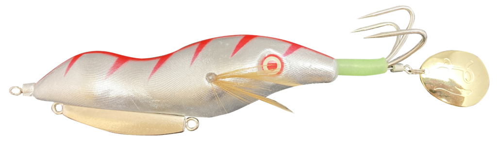 「金ピカマツバ」と「銀ピカマツバ」は水中でのフラッシング効果が高いサテン布を使用。サテン布にゴールド&シルバー下地&ブレードでフラッシング効果が盛りだくさん! 3 つのフラッシング効果で遠くのタコにも強烈アピールするとのこと。