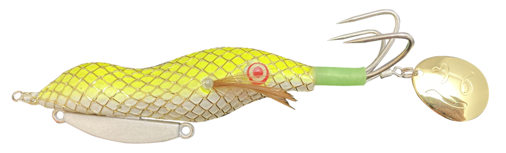 陽が出ている時はフラッシング効果が活かせられる「金ピカマツバ」と「銀ピカマツバ」が特に有効。また、雨の後など濁っている状況では、濁りに強い「チャートメッシュ」と「オレンジメッシュ」が有効。また視認性が良いメッシュ2カラーは、オカッパリでのサイトフィッシングでは非常に使いやすいというメリットもあるんだそう。